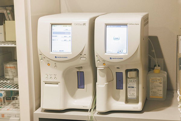 血算(白血球数、赤血球数、など)CRP (C-reactive protein)(炎症の度合いを数値化したもの)を、外来で採血した検体で即時に測定をします。これにより重篤な感染、炎症の度合いを客観的に即時に確認することができます。