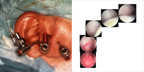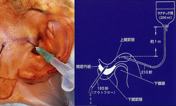 関節腔洗浄療法またはarthrosenntesisと呼ばれる、上関節腔の還流治療で 、複数の注射針を上腔に留置して30分程度をかけて洗浄するものです。