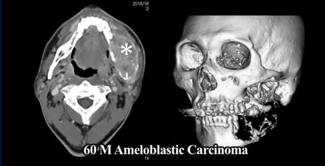 下顎骨悪性腫瘍の術前CT像 (*病巣)