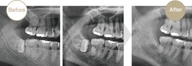 親知らずが原因の嚢胞が大きくなってきたため、親知らずと共に嚢胞も摘出。術後は下歯槽神経麻痺も認めず治癒良好でした。