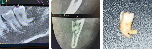 親知らずの根が極端に彎曲し、下歯槽菅(下歯槽神経)に近接していました。根の破折なく抜歯を行い合併症も認めませんでした。